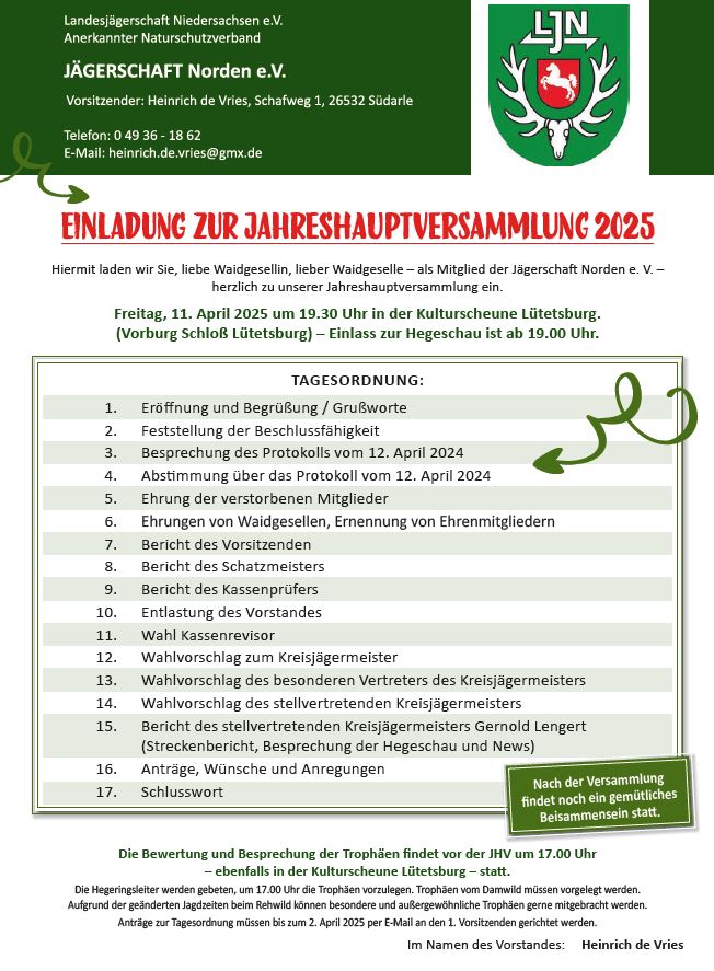 Liebe Jägerinnen und Jäger aus der Jägerschaft Norden e. V., wir laden Euch herzlich zu unserer diesjährigen Jahreshauptversammlung ein!